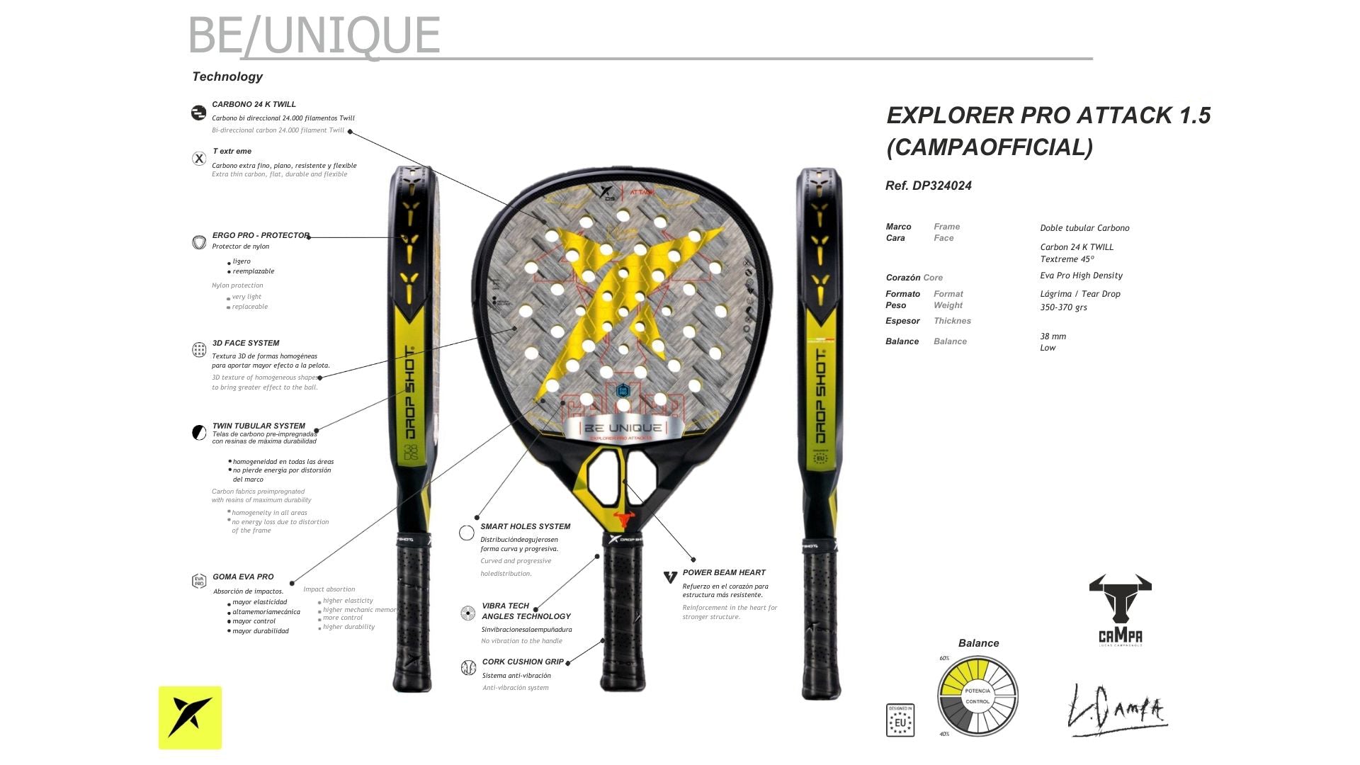 Used by one of the world’s best Padel players in world competition, Lucas Campagnolo. This is a POWER Racket for the player with superb playing expertise. The balance is classed as LOW for greater control and comfort.